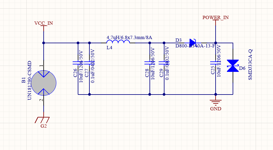 这个电路中,D3二极管作用是防反接。D6是TVS管,可以吸收静电和浪涌能量。B1为气体放电管,也是作为浪涌防护器件。L4电感在此处的作用,只能看作是电源滤波,可能还有B1和D6之间的解耦功能。