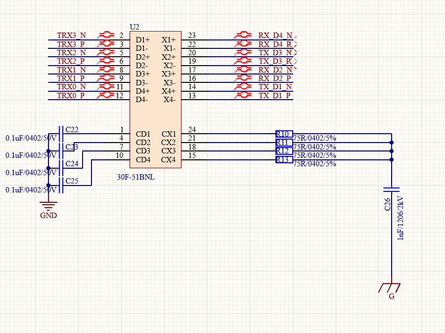 上面网络变压器右侧的75R电阻和1nF电容电路,叫做Bob-Smith电路,浪涌事件存在于信号线到G之间时,信号线上的浪涌能量通过网变的中心抽头,再经过75R电阻和1nF电容到G。这个Bob-Smith电路主要就是作为浪涌的共模防护。