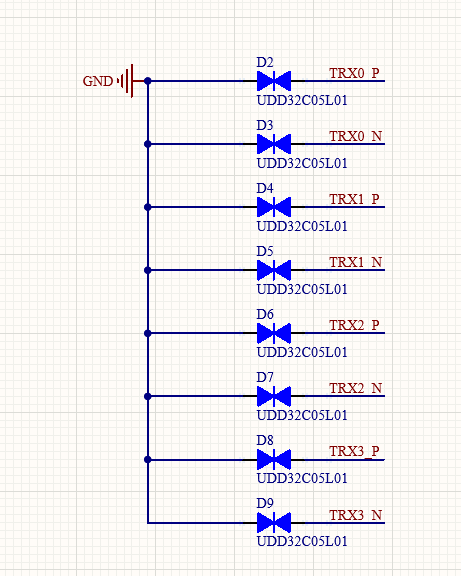 浪涌信号在经过网络变压器之后,能量已经有了一定的衰减,但是还是会耦合到变压器次级线圈上,网变到PHY之间的信号线上,增加TVS就可以将浪涌钳住。