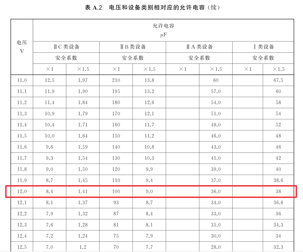 Ⅰ类设备,额定输入电压12V时,1.5倍安全系数时的电容限值为38uF。