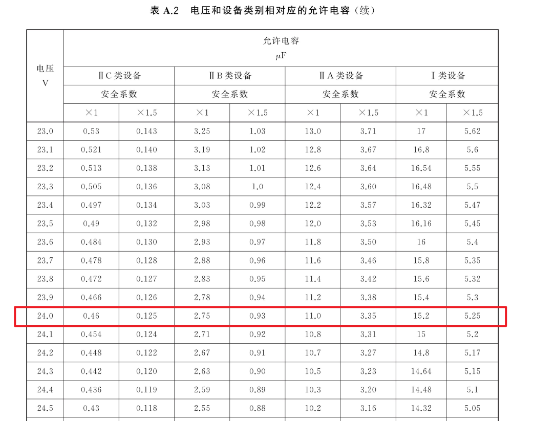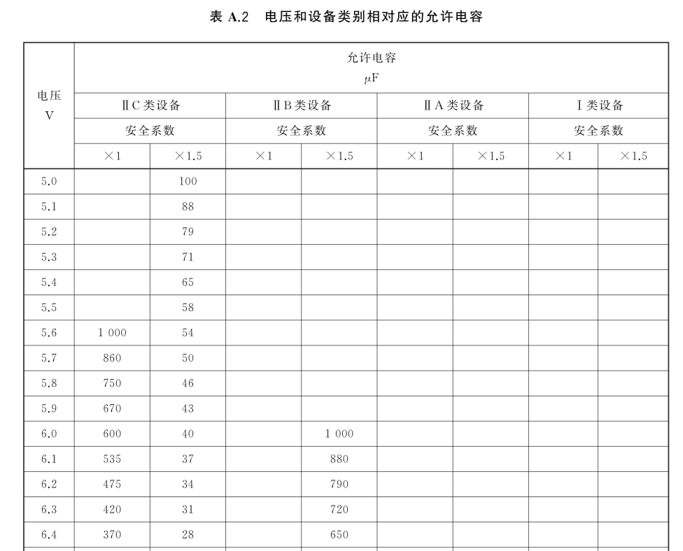 参考GB/T 3836.4 的表A.2 电压和设备类别相对应的允许电容