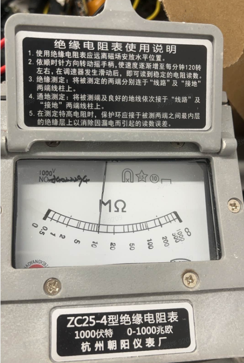 这里使用的是绝缘电阻表,而不是万用表。我手上的绝缘电阻表是摇表,要求是120r/ min的速度摇把手,看指针所指的电阻是多少。