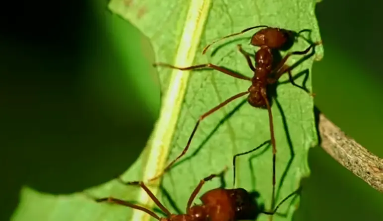 中型工蚁在巢穴外找到新鲜的叶子后,会用锋利的下颌,像裁纸刀一样在叶片上裁剪出适合搬运的大小,再运回巢穴。