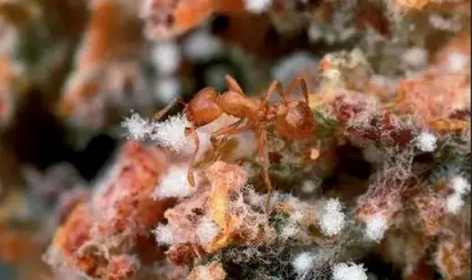 当真菌末端长出菌丝球,就到了收获的季节,这些菌丝球富含蛋白质和糖分,而切叶蚁就是以这些菌丝球为食。他们会将这些菌丝球分配给蚁群中的其他成员。