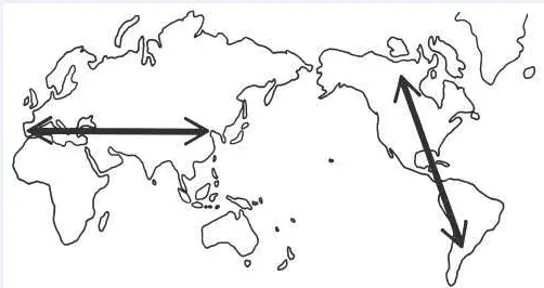 欧亚大陆处于东西向,很大地区处于同一个气候带,其中动植物的扩散阻碍要小很多。而美洲大陆处于南北向,动植物南北向扩散需要适应不同的气候,那么他们就需要先演化至适应当地气候之后才能继续向南北扩散。这样就意味着欧亚大陆的动植物种类比澳洲,美洲丰富得多。